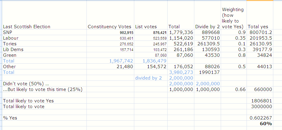 James, can you do the maths based on how exactly we can win this and write up the details on your blog? You know, if you could determine exactly where the postal votes need to be, where the constituency votes need to be (Yes needs to win Glasgow for instance, but list other constituencies you find important) and where the vote registration has to come in at?